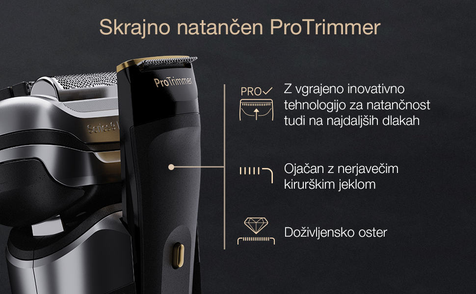 SKRAJNA NATANČNOST CELO NA TEŽAVNIH DLAKAH: vgrajen natančni prirezovalnik ProTrimmer, izboljšan z jeklom kirurške kakovosti, nudi maksimalno učinkovitost celo na brkih, zalizcih in predelu pod nosom.