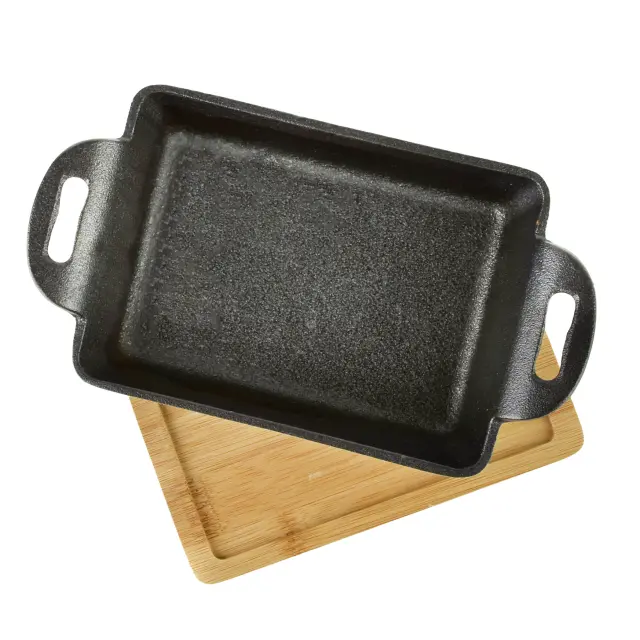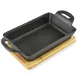 Zaradi kompaktne prostornine 280 ml je posoda odlična za degustacije in postrežbo z izpostavljeno prezentacijo. Praktična ročaja omogočata varno prenašanje, stabilna pravokotna oblika pa zanesljivo uporabo. Priložena pravokotna lesena deska poskrbi za privlačno postrežbo in dodatno zaščito površine mize, zato je komplet primeren tudi za gostinske obrate in posebne dogodke.