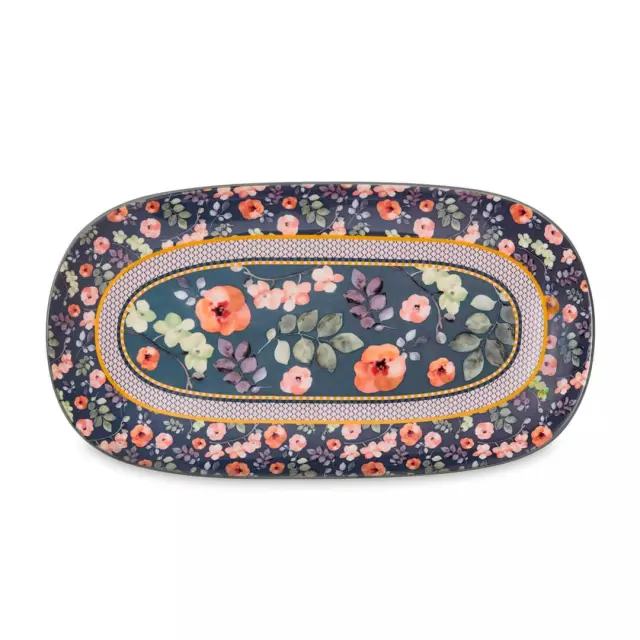 Servirni krožnik Arcadia ima ročno poslikan dizajn s cvetličnimi in geometrijskimi motivi, s toplo paleto barv in eklektičnim, vintage pridihom. Izdelan je iz kakovostne keramike Stoneware in bo družinskim obrokom, večerjam in posebnim priložnostim dodal barvo in značaj. Primeren je za uporabo v mikrovalovni pečici in pomivanje v pomivalnem stroju.