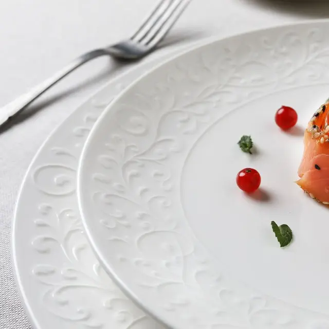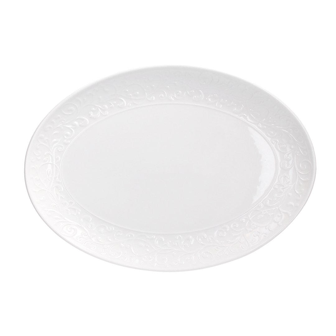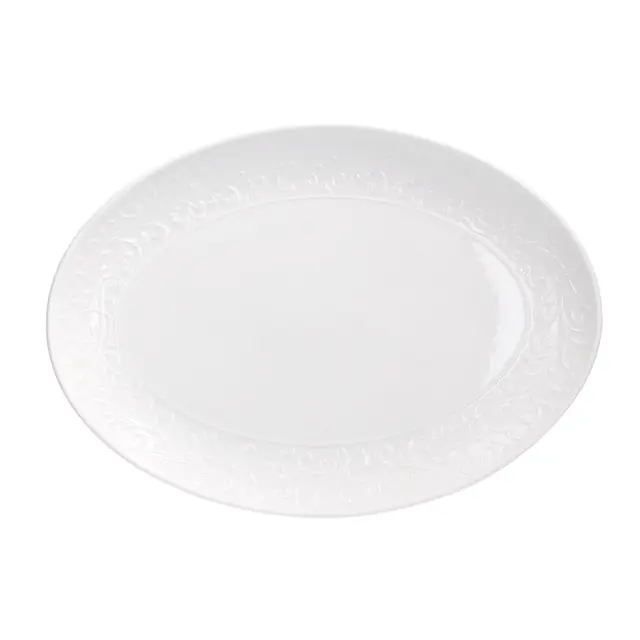 Ovalen servirni krožnik Jasmin dimenzije 30 x 20 cm je del romantične linije, blagovne znamke Tognana, ki se ponaša s cvetličnim reliefnim ornamentom na robovih krožnika, ki spominjajo na cvetoči jasmin. Čiste linije in bela barva bosta na vašo mizo vnesla eleganco in prefinjenost. Krožnik je izdelan iz kakovostnega porcelan, ki je primeren za uporabo v mikrovalovni pečici in pomivanje v pomivalnem stroju. Idealen je za serviranje narezkov, sirov, pečenk, rib, mesa, zelenjave… Kombinirajte ga še z ostalimi izdelki iz iste linije Jasmin.