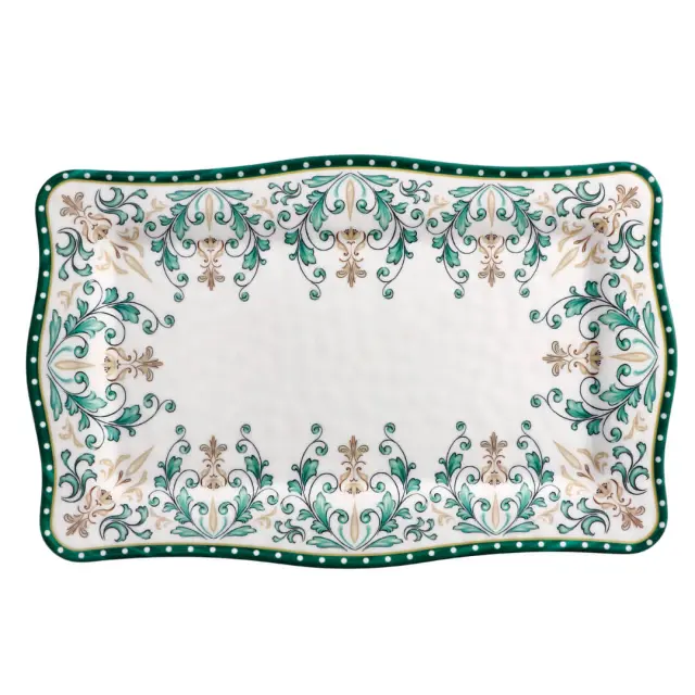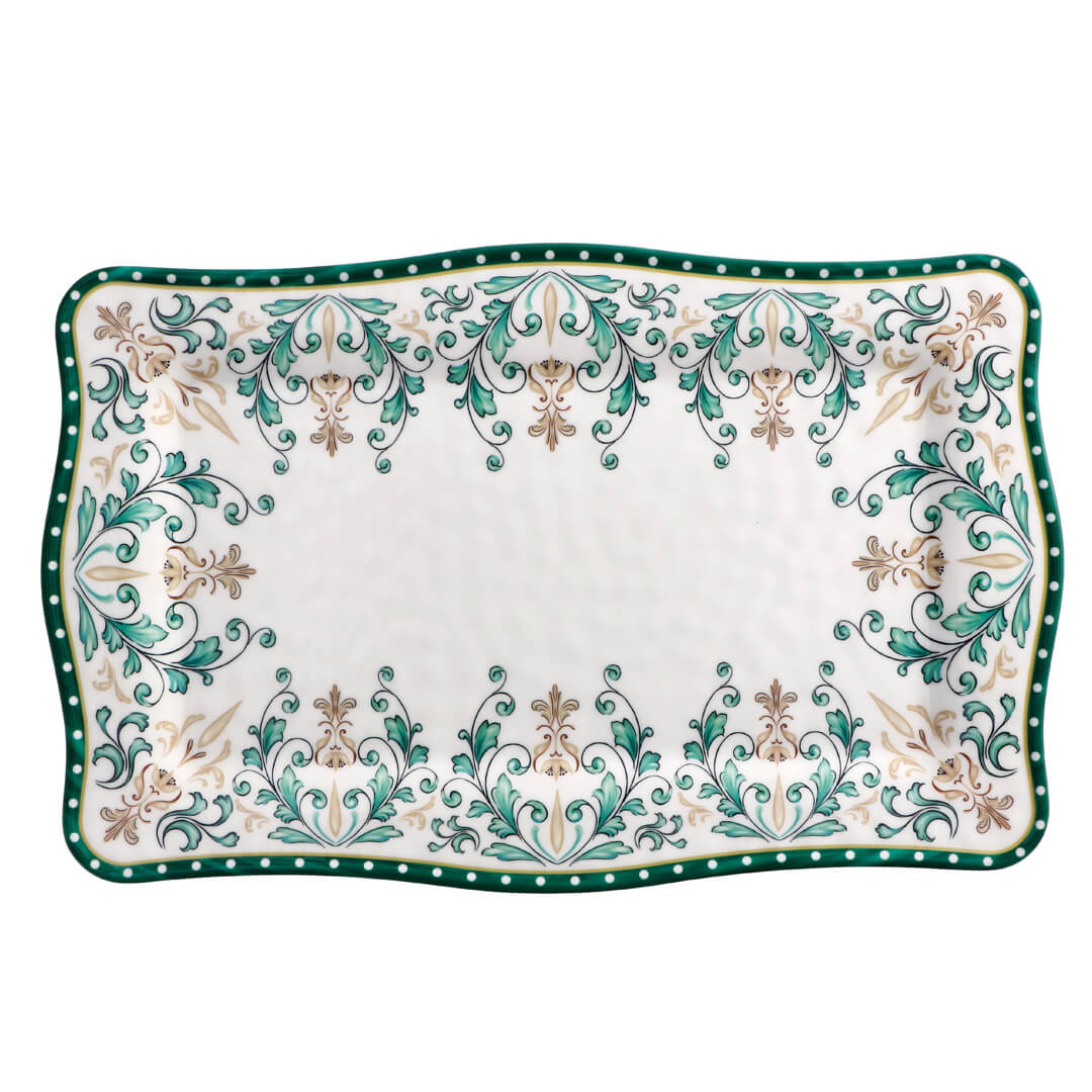 Pravokoten servirni krožnik Kensy Floral z dimenzijami 36 × 23 cm je idealna izbira za postrežbo narezkov, sira, sladic ali drugih prigrizkov na pikniku ali vrtni zabavi. Z dovršenim videzom in robustno zasnovo združuje estetiko in praktičnost kjer koli ga potrebujete. Izdelan je iz vzdržljivega melamina, ki je odporen na udarce in se ne razbije zlahka. Elegantna pravokotna oblika omogoča učinkovito postavitev hrane in lepo predstavitev jedi. Servirni krožnik ni primeren za uporabo v mikrovalovni pečici in pomivanje v pomivalnem stroju.