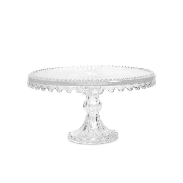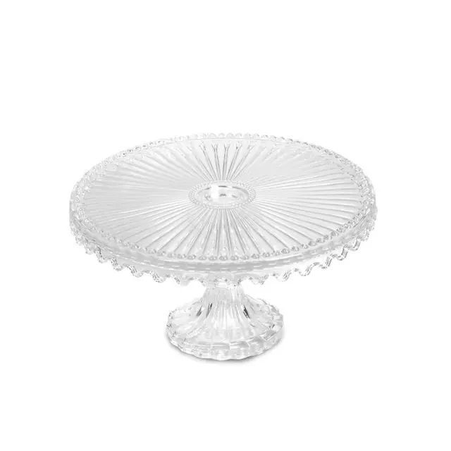 Steklen servirni krožnik na podstavku Glass, okrogle oblike, navdušuje z elegantnim, rebrastim oziroma žarkastim vzorcem na površini. Steklo je prozorno, z valovitim robom, kar mu daje eleganten in estetski pridih. Steklen robusten podstavek zagotavlja stabilnost. Krožnik je primeren za stik z živili, zato je idealen za postrežbo slaščic, peciva ali drugih prigrizkov na eleganten način. Pomijte ga ročno.