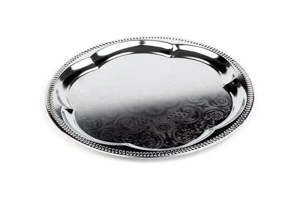 Servirni pladenj iz kovine, okrašen z vzorcem. Idealen za vse različne pogostitve.