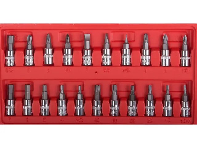 13 końcówek nasadowych: 4 mm, 4,5 mm, 5 mm, 5,5 mm, 6 mm, 7 mm, 8 mm, 9 mm, 10 mm, 11 mm, 12 mm, 13 mm, 14 mm