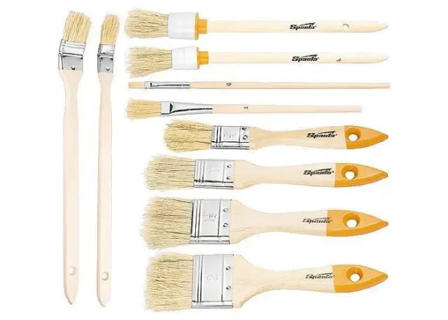 Set ploščatih, okroglih in radiatorskih čopičev Sparta 841155, 10 kos, uporabnih za pleskanje, vključno z oljnimi barvami. Čopiči z naravnimi ščetinami so optimalni za nanašanje formulacij na osnovi topil. Zagotavljajo enakomeren zaključek. Prednosti Ščetine varno drži kovinski trak, ki je obdelan s protikorozijskim premazom za odpornost proti rji.
