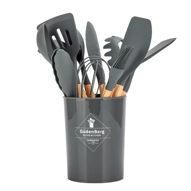 12-delni set najlonskih kuhinjskih pripomočkov z ročaji iz bambusa. Posoda posebej priporočljiva za posodo s keramično in teflonsko prevleko. Material, iz katerega so izdelane, ne praska površine posode. Odporen je na visoke temperature do 210 stopinj C. Ima posebne antibakterijske lastnosti.