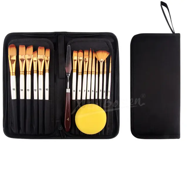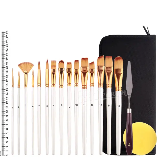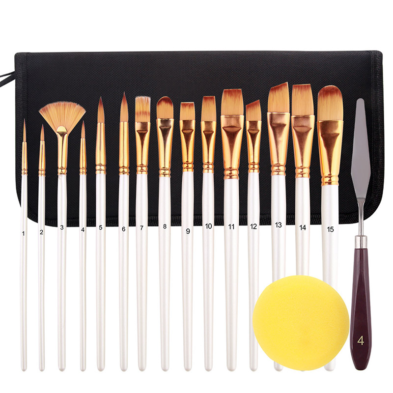 Vsestranski izbor čopičev: Ta obsežen komplet vsebuje 18 čopičev različnih oblik in velikosti, ki ustrezajo širokemu spektru tehnik slikanja. Od širokih potez do zapletenih podrobnosti boste našli popoln čopič za vsak vidik vaše umetnine.