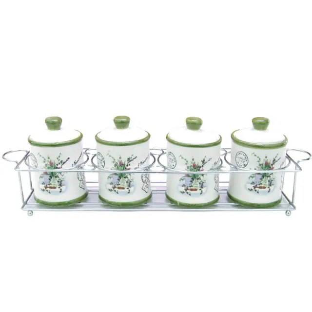 SET 4 POSOD ZA ZAČIMBE MAESTRO MR-20065-04CS Set kuhinjskih posod iz debele keramike. Sodoben eleganten ergonomski dizajn. Zelo zanimiv dizajn. Ekološko čist, kemično nevtralen material - keramika. Ta komplet ni samo zelo praktičen, ampak tudi zelo dekorativen. Priročnost in enostavnost uporabe. Posode imajo kovinsko stojalo. Izdelek je izdelan iz kvalitetne keramike, ki je zelo elegantna. Poleg tega ga odlikuje vzdržljivost in brezčasen videz.