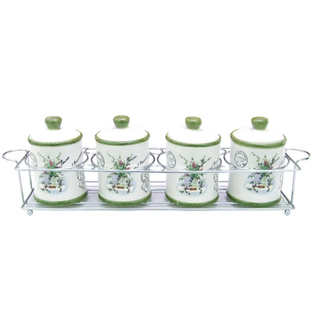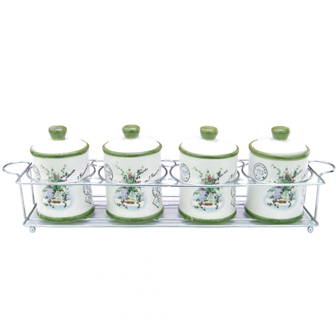 SET 4 POSOD ZA ZAČIMBE MAESTRO MR-20065-04CS Set kuhinjskih posod iz debele keramike. Sodoben eleganten ergonomski dizajn. Zelo zanimiv dizajn. Ekološko čist, kemično nevtralen material - keramika. Ta komplet ni samo zelo praktičen, ampak tudi zelo dekorativen. Priročnost in enostavnost uporabe. Posode imajo kovinsko stojalo. Izdelek je izdelan iz kvalitetne keramike, ki je zelo elegantna. Poleg tega ga odlikuje vzdržljivost in brezčasen videz.