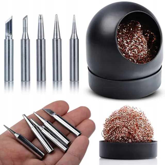 ✅ Čistilec za konice v kovinskem podstavku:To je nepogrešljivo orodje pri spajkanju, ki omogoča natančno čiščenje konice spajkalnika in vzdrževanje reda na delovnem mestu.
