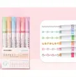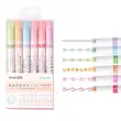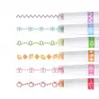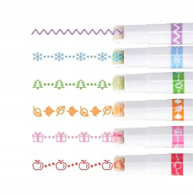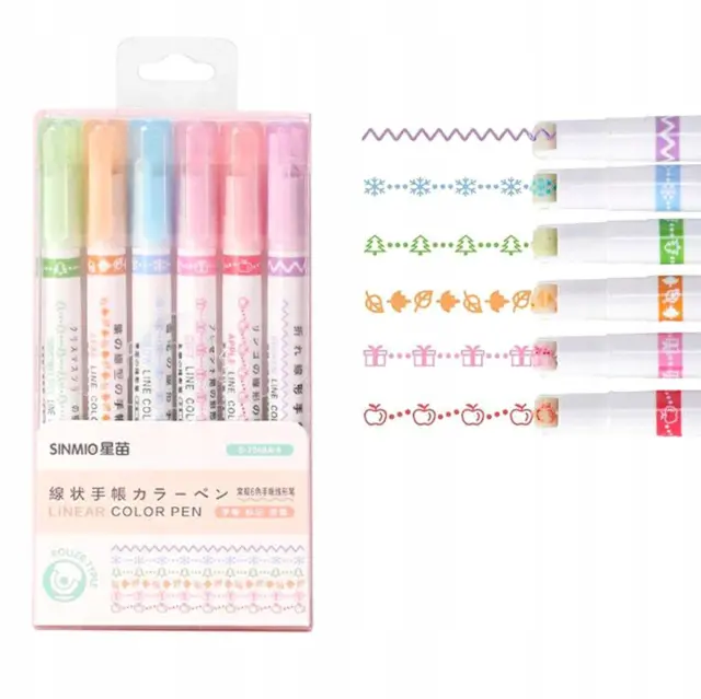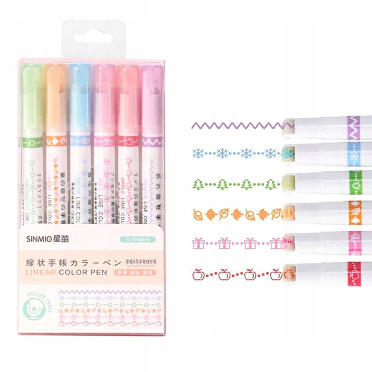 Set 6 različnih barvnih markerjev. Vsak marker nariše drugačen vzorec. Privlačen videz vzorcev bo otroke spodbudil k učenju pisanja. Popolne so za poudarjanje zapiskov ali ustvarjanje okraskov. Zaradi ergonomske oblike so peresa udobna za uporabo. Črnilo se hitro suši, zato se zapiski ne razmažejo.