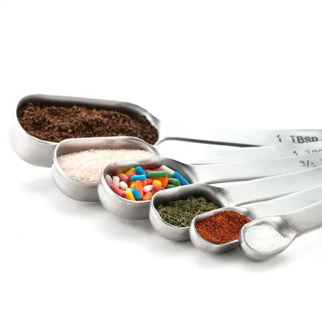 Visokokakovostno nerjaveče jeklo: Te merilne žličke so narejene iz visokokakovostnega nerjavečega jekla 430, zato so zdržljive. Odporni so na rjo, korozijo in madeže, zaradi česar so zanesljiv in trajen dodatek vaši kuhinji.