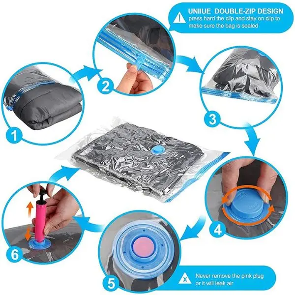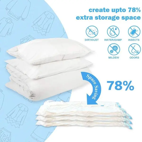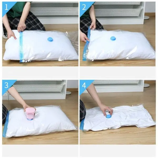 Te vrečke so idealne za shranjevanje oblačil, posteljnine, odej, igrač, sezonskih oblačil in drugih mehkih predmetov, tako za kratkotrajno kot dolgoročno obdobje. Dodatna prednost je priložena potovalna tlačilka za ročno izpihovanje, ki omogoča enostavno uporabo vrečk tudi na potovanjih ali izletih, kjer si lahko hitro in enostavno ustvarite več prostora za shranjevanje svojih stvari.