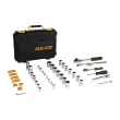 V tem kompletu boste našli do 33 nastavkov 25L, deset nastavkov ¼” in 16 nastavkov ½”. Imeli boste tudi tri imbus ključe, dva ključa z ragljo, univerzalni zglob, ¼” držalo za vtičnico, ¼” spojko, tri podaljške, kot tudi vžigalno svečko in 3x glavo. Vse je shranjeno v priročni in stabilni škatli za orodje, ki jo lahko preprosto vzamete kamor koli.