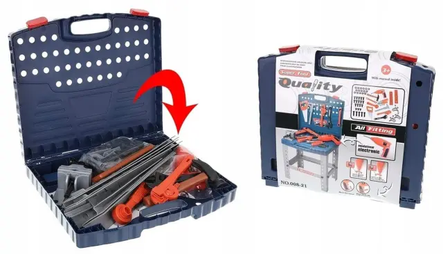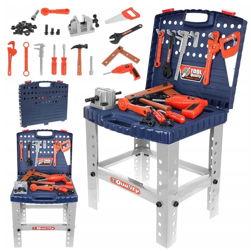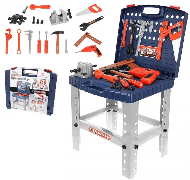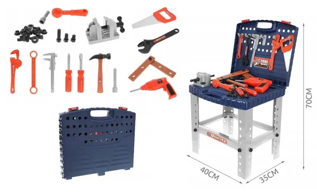 Ta kompleten set vključuje funkcionalni otroški vrtalnik, prenosni kovček in delovno mizo, ki poskrbi za ure zabavne igre in učenja. Otroci bodo uživali v igri mojstra in hkrati razvijali fino motoriko, domišljijo ter razumevanje osnovnih delovnih orodij.