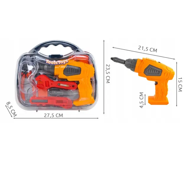 SPECIFIKACIJA – starost: 3+; certifikati: CE, EN 71; moč vrtalnika: 3x AA (ni vključen); mere kovčka (dolžina / širina / višina): 8,5 / 27,5 / 23,5 cm; mere svedra (dolžina / širina / višina): 21,5 / 15 / 4,5 cm; teža kompleta: 650g.
