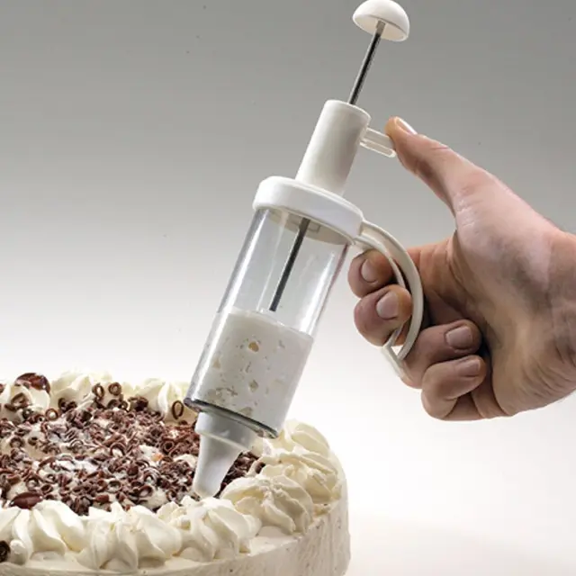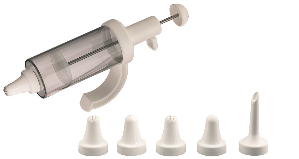 Westmark dekorativna brizgalka, s prostornino 180 ml, je izdelana iz plastične mase (PE, PP, PS, SAN) in je s 5 različnimi nastavki oz. šobami idealna za dekoriranje peciva ali tort ter polnjenje krofov, mafinov…. Najdaljši nastavek je dolg 64 mm, ostali pa 38 mm. Priročen sistem s pritiskom s palcem omogoča enostavno uporabo, vzmet iz nerjavečega jekla pa dekoriranje s čvrstejšimi nadevi. Ne glede na to, ali ste izkušen kuhar ali ljubiteljski slaščičar, bo dekorativna bizgalka Westmark vaša zvesta sopotnica pri ustvarjanju jedi, ki bodo prava paša za oči in brbončice. Primerno za pomivanje v pomivalnem stroju.
