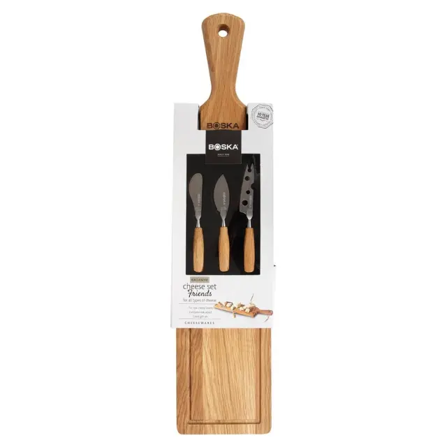 BOSKA Friends, set z leseno podolgovato desko za rezanje in 3 različnimi noži za sir je kot nalašč za prijetno druženje s prijatelji, ki ga lahko pospremite z izbrano pijačo in okusno ploščo s siri. Deska iz hrastovega lesa ustvarja rustikalen videz, set nožev pa je primeren za rezanje od mehkih, kremnih sirov, do tistih najtrših. Rezila nožev so izdelana iz kakovostnega nerjavečega jekla, svojo piko na i dodelanemu videzu nožev pa daje ročaj iz hrastovega lesa. Špičasta konica noža zdrobi trd sir na manjše koščke, za mehke in poltrde sire je idealen nož z luknjami, saj se zaradi njih sir ne bo sprijemal na rezilo, z zadnjim nožem iz seta pa lahko namažete najbolj okusne mazave sire, česnovo maslo ali tapenade. S pravilno nego vam to ta kompet zdržal leta. Desko in nože perite ročno.