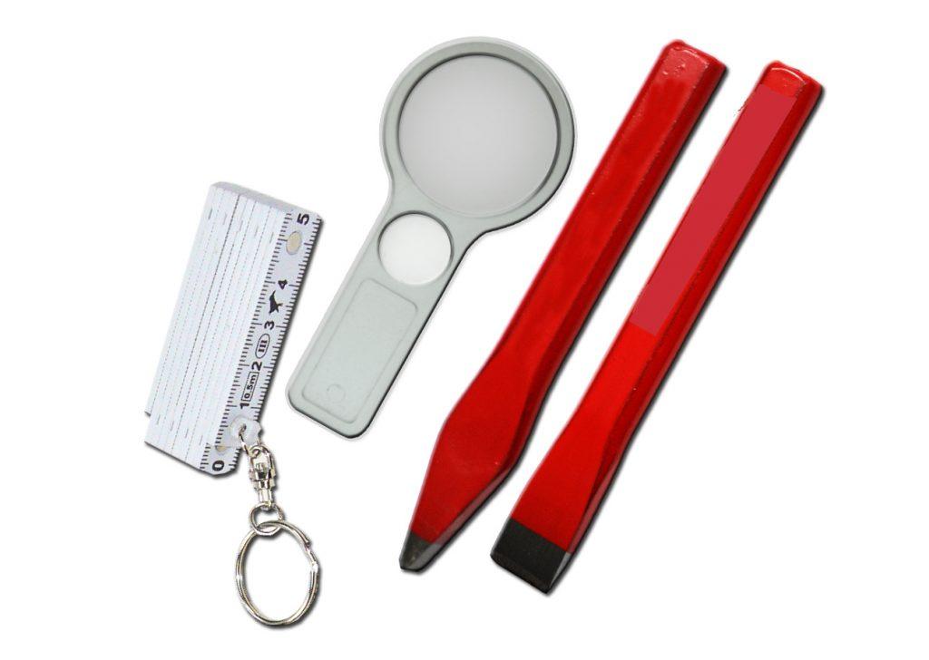 Set opremljen z dvema dletoma, majhnim zložljivim ravnilom in kompaktno plastično povečevalno steklo