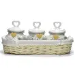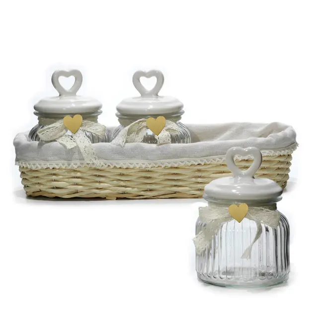 Set steklenih doz oz. posod je idealen za shranjevanje žitaric, začimb, moke, sladkorja, soli, bonbonov… Izdelan je iz trpežnega prozornega stekla, ki omogoča stalen vpogled v posodo, prostornine 550 ml. V setu so tri doze premera 11,2 cm in višine 17 cm. Bel keramični pokrov z ročajem v obliki srca, omogoča hermetično zapiranje, pletena košara pa poskrbi za dodaten okras. Primerno za pomivanje v pomivalnem stroju (samo kozarec in pokrov).