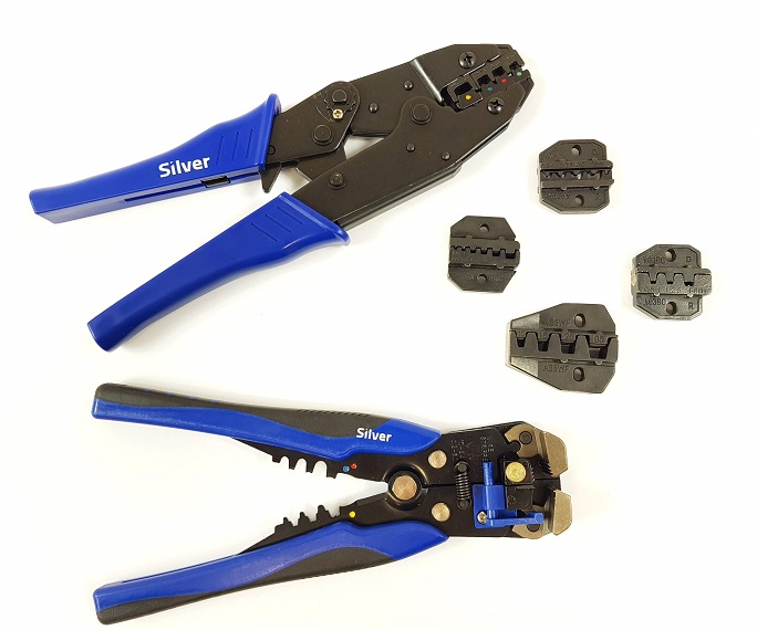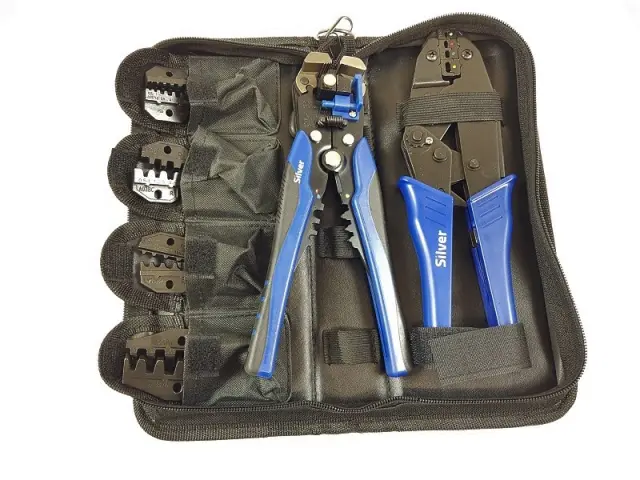 Komplet sestavljajo klešče z avtomatskim, nastavljivim zaskočnim mehanizmom in zamenljive matrike, prilagojene petim vrstam elektrotehničnih konektorjev.