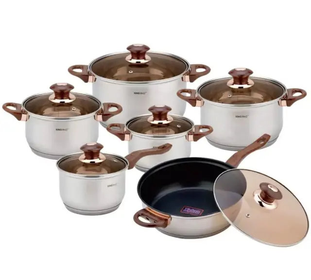 Set 5 loncev in 1 ponev iz nerjavečega jekla s steklenimi pokrovi KINGHOFF. Lastnosti: Material: nerjaveče jeklo na obeh straneh. Osvetljevalci v roza zlatu. Klasičen dizajn. Toplotno odporni, ergonomski in kovičeni ročaji iz bakelita (imitacija lesa, z rožnato zlatimi poudarki). Teflonska ponev (XyLan) z valovitim dnom za enostavno cvrtje in pečenje na žaru. Stekleni pokrovi z odprtinami za paro v barvi rjavega stekla. Aku-termalna dna zagotavljajo odlično porazdelitev toplote in znatne prihranke energije, kar pomeni daljše ohranjanje toplote v posodi. Široki ovratniki olajšajo pasiranje hrane. Pomanjkanje pregibov v notranjosti posode preprečuje nabiranje delcev hrane. Enostaven za čiščenje in pranje. Primerno za pomivanje v pomivalnem stroju: da Set vsebuje: Lonec s pokrovom, prostornina. 6,6L (24 x 14,5 cm) Lonec s pokrovom, prostornina 3,9L (20 x 12,5 cm) Lonec s pokrovom, prostornina 2,9L (18 x 11,5 cm) Lonec s pokrovom, prostornina 2,1 L (16 x 10,5 cm) Ponev s pokrovom, prostornina 2,1L (16 x 10,5 cm) Ponev s teflonsko prevleko (XyLan) s pokrovom, prostornina 3,4 L (24 x 7,5 cm) *kapaciteta po deklaraciji proizvajalca.