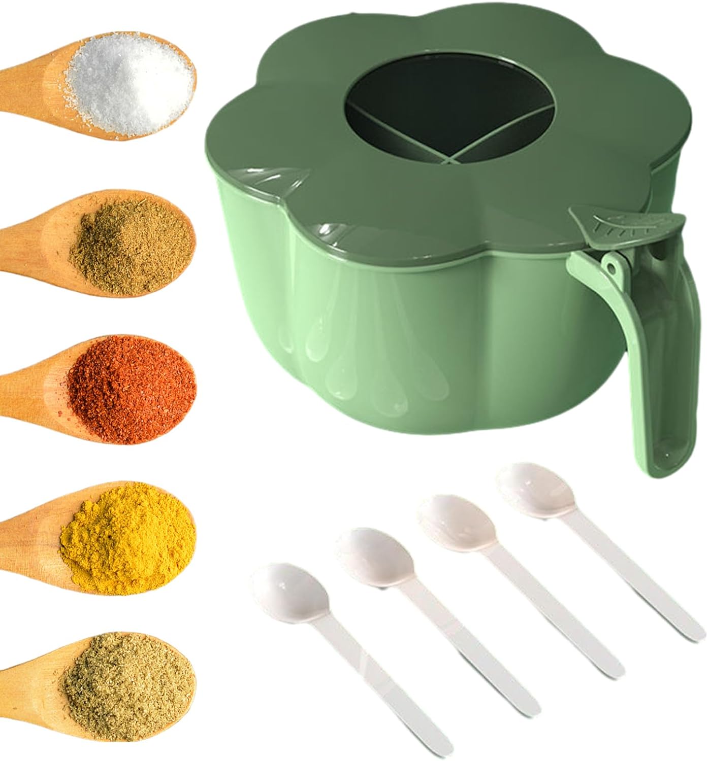 PREPROST ZA UPORABO: enoročno upravljanje olajša dostop do začimb tudi med napornimi trenutki kuhanja. Zasnova stranskega ročaja vam olajša nošenje s seboj. Pritisnite, da odprete za brezhibno delovanje. ORGANIZIRANO IN MODERNO: Ta posoda za sol in sladkor ima prozoren pokrov na sredini, tako da lahko jasno vidite notranjost in zlahka prepoznate vsako začimbo, ne da bi morali odpreti pokrov. Prav tako ima veliko zmogljivost in lahko sprejme veliko količino začimb, zaradi česar je kuhanje bolj priročno in prijetno. ENOSTAVNO VZDRŽEVANJE: Ta škatla za začimbe s 4 predelki in zaprto žlico je izdelana iz gladkega PP materiala in jo je mogoče enostavno očistiti z vlažno krpo. uporabo, s čimer zagotovite, da vaši vohuni ostanejo higienski. Preprosta oblika rože doda pridih elegance in je popolna za vsak kuhinjski dekor. TRŽLJIV IN ORGANIZIRAN: Brezhibno shranite različne sorte začimb v našo škatlo za začimbe s posameznimi predelki in zaprtimi žlicami. Zasnova, odporna proti prahu, in odlično tesnjenje preprečujeta kontaminacijo z oljem ter zagotavljata varno in higienično shranjevanje, obenem pa omogočata enostaven dostop do začimb. OBLIKA 4 V 1: Naša škatla za začimbe z ločenimi razdelki ima razdeljeno mrežo in prozoren pokrov, ki je odlična rešitev za ohranjanje prvotnega okusa in arome vaših začimb. Vrtljiv pokrov, zaščiten pred posegi, preprečuje kontaminacijo, medtem ko vam priročna zasnova 4 v 1 omogoča enostavno shranjevanje različnih vrst vohunov.