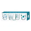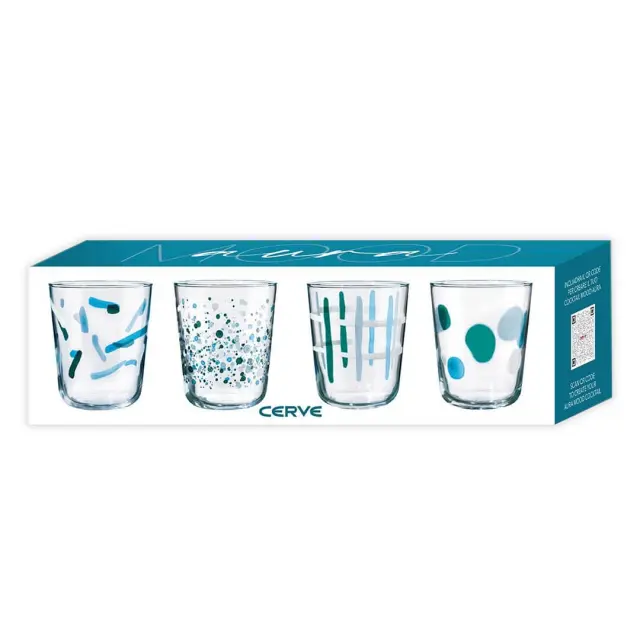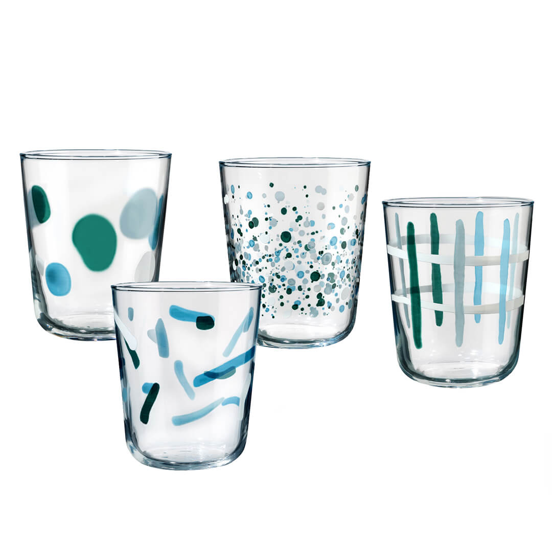 Set 4 steklenih kozarcev s sodobnimi zeleno-modrimi vzorci bo poživil vsak pogrinjek. Kozarci imajo edinstven potisk – od točk do črt in razpršenih pik – zato so odlična izbira za serviranje vode, sokov, limonade ali osvežilnih koktajlov. Izdelani so iz prozornega stekla s prostornino 315 ml, vendar pa niso primerni za pomivanje v pomivalnem stroju, saj se lahko zaradi visoke temperature in močnega curka vode barvni potisk sčasoma obrabi ali zbledi. Za ohranjanje lepega videza in obstojnosti vzorcev priporočamo ročno pomivanje.