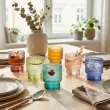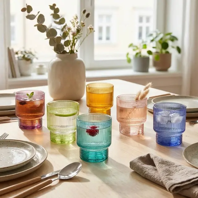 Set Todomodo vključuje šest kozarcev iz kakovostnega pihanega stekla, pobarvanega po celotni površini. Njihova premišljena oblika omogoča enostavno zlaganje, zato so zelo praktični za shranjevanje, hkrati pa na mizi delujejo elegantno in sodobno. Posebnost kozarcev je navpična žlebičasta struktura. Ta dekorativni detajl kozarcu doda omogoča boljši oprijem in ustvari zanimiv vizualni učinek. Barvni kozarci popestrijo vsako pogrnitev mize. Zaradi svoje vsestranske velikosti so primerni za serviranje vode, sokov, osvežilnih napitkov ali koktajlov. Primerni so za pomivanje v pomivalnem stroju, vendar se za ohranjanje intenzivnih barv in nežne izdelave priporoča ročno pomivanje.