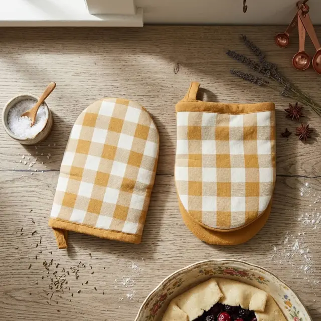 Set dveh kuhinjskih prijemalka Gingham je izdelan iz 100 % bombaža s karo vzorcem. Prijemalki nudita trden oprijem pri premikanju vroče posode in ponv. Zahvaljujoč praktični zasnovi in priročni zanki za obešanje ju je enostavno shraniti. | SESTAVA: 100% bombaž. Polnilo:100% poliester | VZDRŽEVANJE: Pranje v pralnem stroju na 30°C. Beljenje ni dovoljeno. Sušenje v sušilnem stroju ni dovoljeno. Zmerno vroče likanje do 150°C. Kemično čiščenje ni dovoljeno.
