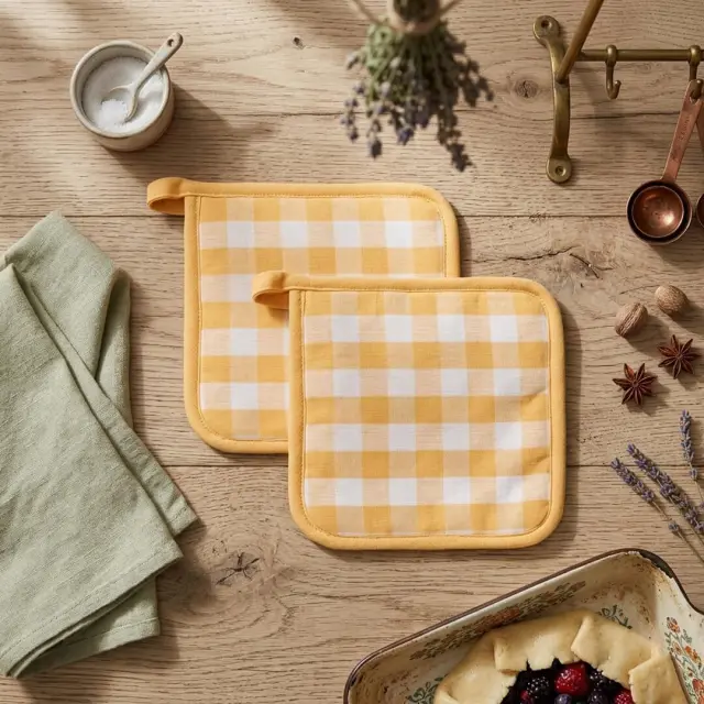 Set dveh kuhinjskih prijemalka Gingham je izdelan iz 100 % bombaža s karo vzorcem. Kvadratni prijemalki nudita zaščito pri premikanju vroče posode in ponv. Zahvaljujoč praktični zasnovi in priročni zanki za obešanje ju je enostavno shraniti. | SESTAVA: 100% bombaž. Polnilo:100% poliester | VZDRŽEVANJE: Pranje v pralnem stroju na 30°C. Beljenje ni dovoljeno. Sušenje v sušilnem stroju ni dovoljeno. Zmerno vroče likanje do 150°C. Kemično čiščenje ni dovoljeno.
