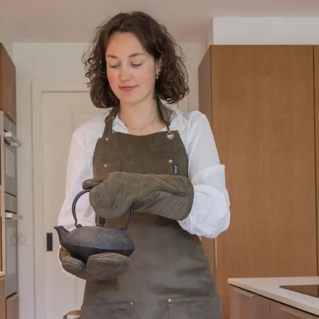 Ravnajte z vročo posodo varno in elegantno s setom kuhinjskih rokavic Velmar, izdelanih iz mehke, a trpežne rebraste velur tkanine. Komplet vključuje dve rokavici, zasnovani tako, da se udobno prilegata levi ali desni roki. Prefinjen prešit vzorec poskrbi za eleganten videz, medtem ko silikonske črte na dlani zagotavljajo varen, nedrseč oprijem. Popolna izbira za samozavestno dvigovanje vročih loncev, ponev in pladnjev v vsakodnevni kuhinji. | SESTAVA: 80% bombaž, 20% poliester. Polnilo: polibombaž. Zunanjost: silikon | VZDRŽEVANJE: Pranje v pralnem stroju na 30°C. Perite ločeno. Sušenje v sušilnem stroju ni dovoljeno. Likanje ni dovoljeno. Beljenje ni dovoljeno. Kemično čiščenje ni dovoljeno.