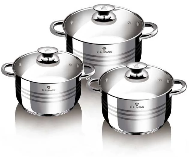 6-DELNI SET LONCEV IZ NERJAVEČEGA JEKLA BLAUMANN GOURMET LINE BL-3160 Kuhinjske posode Blaumann so izdelki, v katere je vredno investirati, saj bodo svojo vrednost dokazali z vsako uporabo. Izpolnjujejo zahteve najboljših kuharjev. Izdelana iz visokokakovostnega nerjavečega jekla s sijajnim zaključkom in 3 satenastimi okrasnimi črtami. Imajo 5-slojno dno, zahvaljujoč kateremu lonci zelo hitro in enakomerno porazdelijo toploto, ne da bi se hrana zažgala. Zakovičeni ročaji, ki se ne segrevajo. Na notranji strani sten lonca je merilna skodelica. Stekleni pokrovi z jeklenimi ročaji. Primerni so za pomivanje v pomivalnem stroju. Primerno za uporabo na vseh vrstah štedilnikov, vključno z indukcijo. Popolnoma varen in nevtralen v stiku s hrano. Uporaba visokokakovostnih materialov zagotavlja dolgoletno učinkovito uporabo kompleta. Set vsebuje: lonec s pokrovom (O16×9,5 cm 2,1L) lonec s pokrovom (O18×10,5 cm 2,5L) lonec s pokrovom (O20×11,5 cm 3,9L)