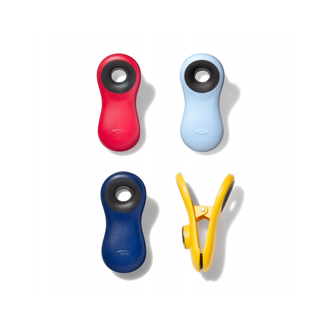Magnetne ščipalke Oxo so večje od povprečnih in bodo učinkovito znova zaprle odprte vrečke kosmičev, kave, sladkorja, moke … in tako preprečile, da bi se vsebina na zraku posušila, strdila ali pa se preprosto razlila po vaših omarah. Zahvaljujoč magnetu na zadnji strani sponke obesite svoje zapiske, nakupovalne sezname ali otroške risbe na hladilnik. V kompletu so 4 magnetne ščipalke v rdeči, temno modri, svetlo modri in rumeni barvi. Izdelane so iz čvrste in vzdržljive plastike ter nerjavečega jekla, z mehkimi in udobnimi ročaji za enostavno odpiranje. Primerne so za uporabo v hladilniku, zamrzovalniku in pomivanje v pomivalnem stroju. Majhna luknja omogoča, da jih po uporabi obesite.