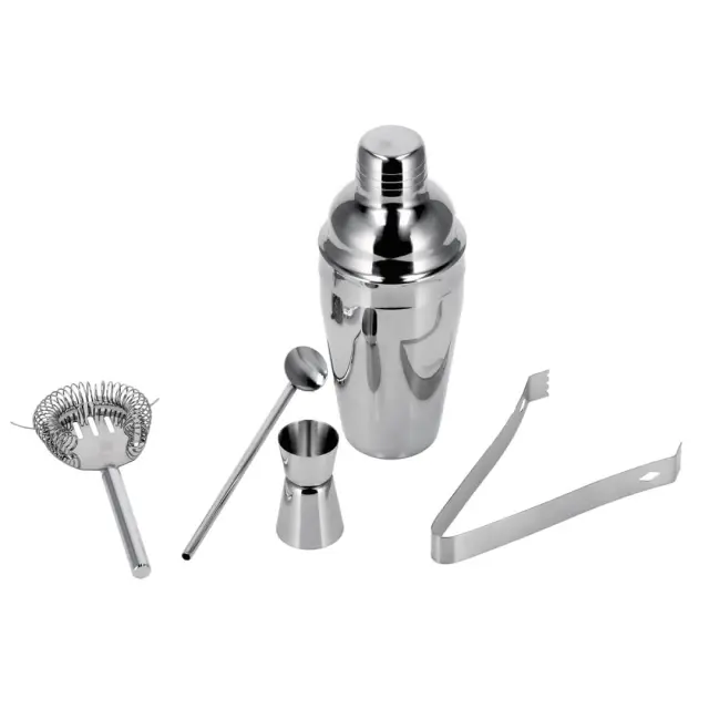 5-delni set mešalnik za cocktaile vsebuje shaker s prostornino 500 ml ter pripomočke za pripravo odličnih in osvežilnih pijač (cedilce, žlička, merica, prijemalka za led). Izdelan je iz nerjavečega jekla in je nepogrešljiv pripomoček v poletnih dneh ter na različnih praznovanjih. Lahko ga pomijete v pomivalnem stroju.