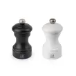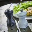 Dvojec mlinčkov Duo za sol in poper v črno-beli mat barvi posnema simbolično obliko prvega mlinčka Peugeot, zasnovanega leta 1874. Mlinčka sta izdelana iz bukovega lesa in opremljena z vrhunskim mehanizmom iz nerjavečega jekla Peugeot, znanim po izjemni trpežnosti in natančnosti mletja. Mehanizem omogoča nastavitev stopnje mletja z enostavnim vrtenjem gumba: bolj ko ga zategnete, bolj fino bo mletje – in obratno. Fino mletje poudari intenzivnost arom, medtem ko grobo mletje razkrije njihovo subtilnost. Ergonomska oblika omogoča udoben oprijem in natančno doziranje začimb, zato sta mlinčka popolna spremljevalca pri kuhanju ali strežbi.