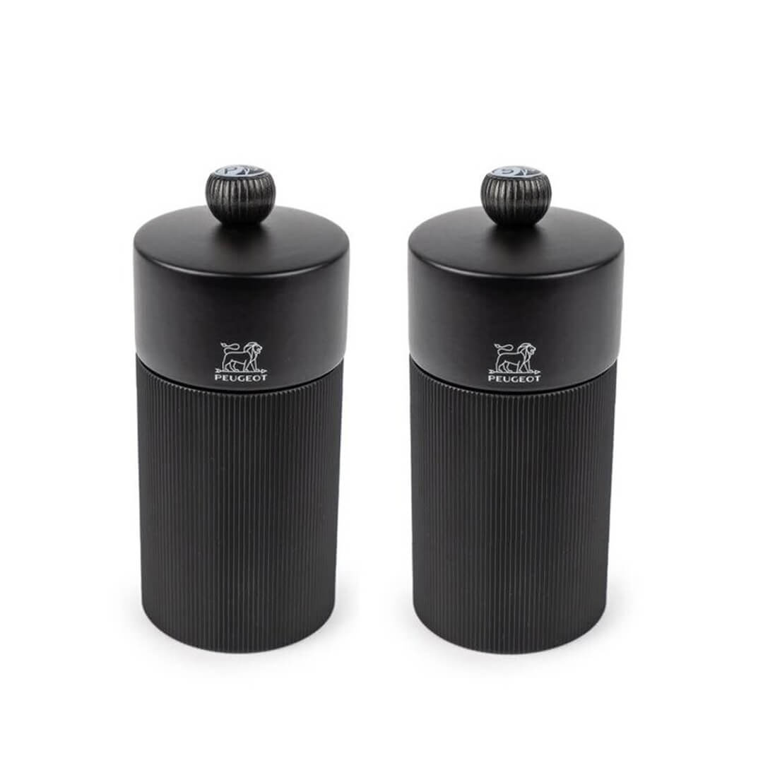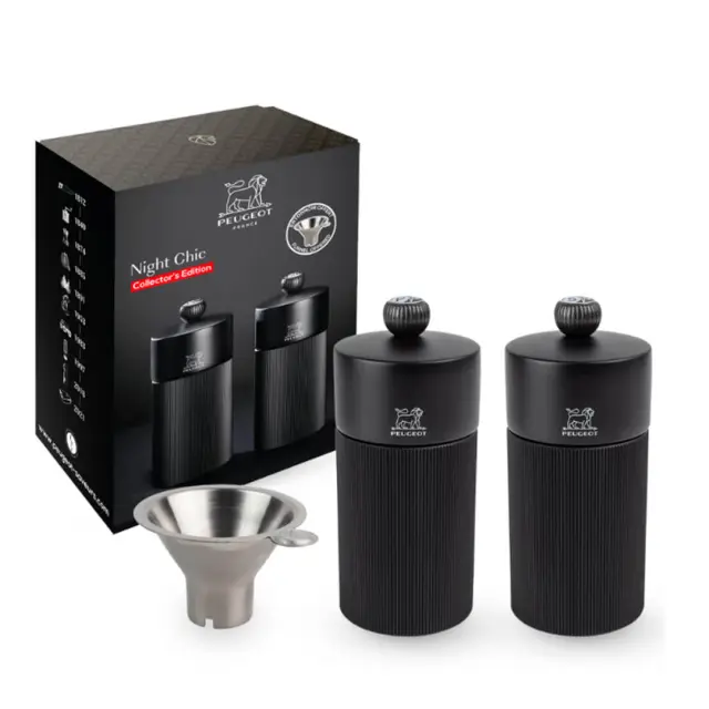 Set dveh mlinčkov za poper in sol Line Nigt Chic navdušuje z ohišjem iz črtastega črnega aluminija in lesenim vrhom, ki izžareva sodoben šarm in toplino naravnih materialov. Mlinčka sta popoln dodatek za mizo ali kuhinjo, saj ponujata stilsko kombinacijo materialov in vrhunski grafični učinek. Popoln zaključek obeh mlinčkov je še posebej eleganten kovinski gumb na vrhu, označen s črko S (sol) ali P (poper), ki omogoča prepoznavanje vsebine. Mlinčka sta opremljena z vrhunskim mehanizmom iz nerjavečega jekla Peugeot, znanim po izjemni trpežnosti in natančnosti mletja. Mehanizem omogoča nastavitev stopnje mletja z enostavnim vrtenjem gumba: bolj ko ga zategnete, bolj fino bo mletje – in obratno. Fino mletje poudari intenzivnost arom, medtem ko grobo mletje razkrije njihovo subtilnost.
