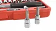 Komplet je opremljen s številnimi nastavki, nastavki za izvijač, podaljški (vključno z fleksibilnimi), 2 vrstama gumbov – izvijačem in vzdolžnim, kardanskim zglobom, adapterjem in ragljo s stikalom, ki omogoča hitro in enostavno spreminjanje smeri vrtenja. Vsak od podaljškov, gumbov, raglje in kardanskega zgloba je opremljen s kroglico, ki preprečuje izpadanje kapice – izboljša učinkovitost dela in vpliva na udobje in varnost, nobena kapica med delom ne bo izpadla.
