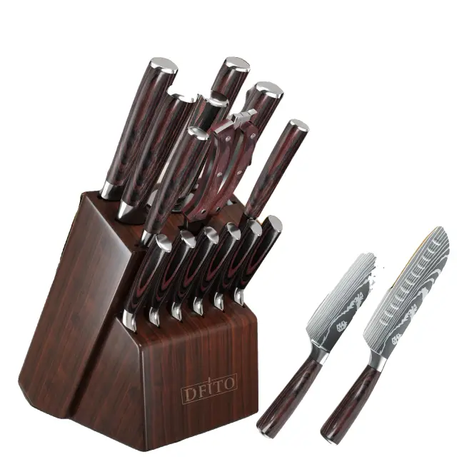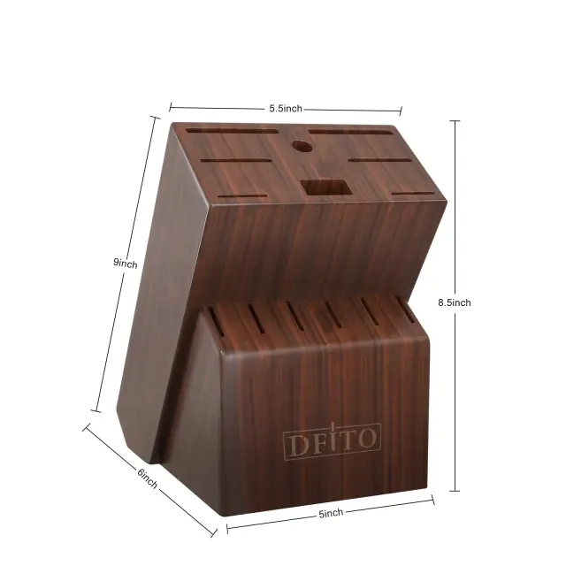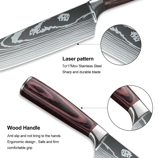 • Eleganten rešitev za shranjevanje: Noži prihajajo z lepim, trdnim lesenim blokom za nože, ki zagotavlja varno shranjevanje in hkrati izboljšuje dekoracijo vaše kuhinje, ter ohranja vaše rezila organizirana in enostavno dostopna.