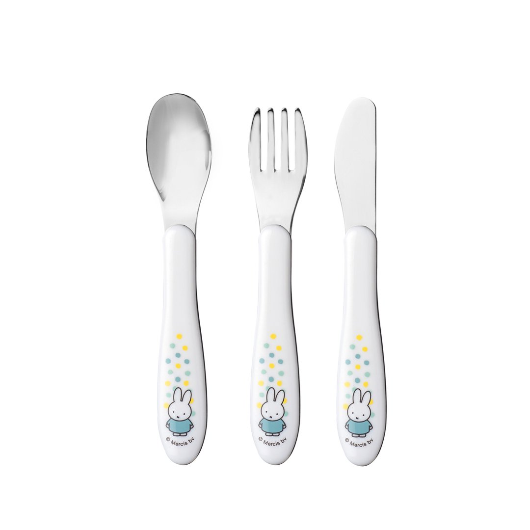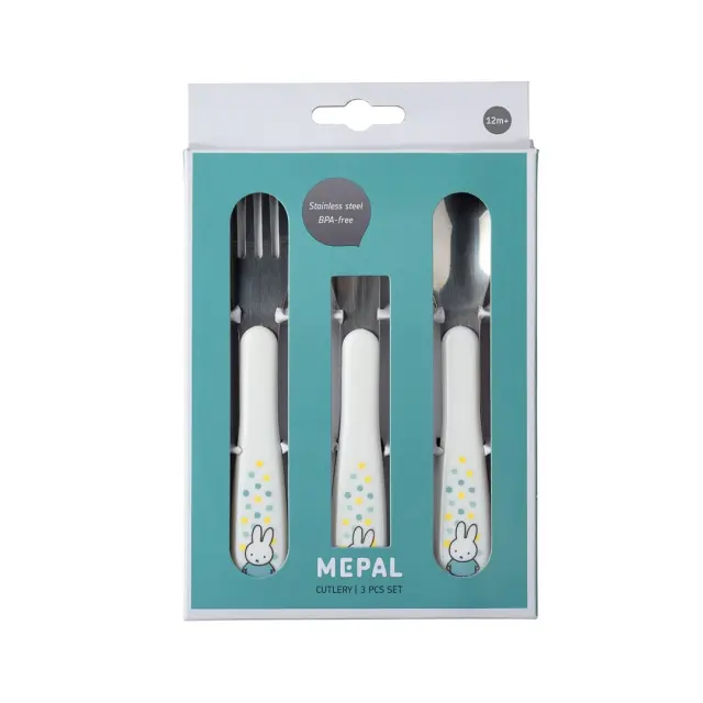 Prvi pribor za vašega malčka Miffy Confetti, od prvih poizkusov hranjenja z majhnimi grižljaji do popolnoma samostojnega hranjenja sestavljajo nož, vilica in žlica. Izdelan je iz nerjavečega jekla z ročaji iz kakovostne ABS plastike za udoben oprijem malih otroških rokic, na katerih je narisan ljubek motiv zajčka. Pribor je primeren za pomivanje v pomivalnem stroju in 100 % brez BPA .