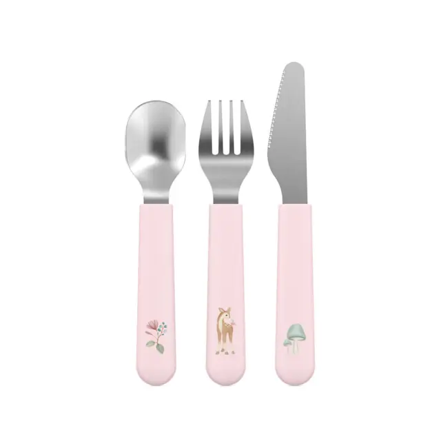 Otroški jedilni pribor Mio je ustvarjen za otroka, ki pridobiva novo veščino hranjenja. Oblikovan je za majhne roke in usta. Komplet vsebuje vilice, nož in žlico, točno tisto, kar vaš malček potrebuje za samostojno uživanje celotnega obroka. Primeren je za malčke in predšolske otroke od 12 mesecev dalje. Izdelan je iz nerjavečega jekla, ročaji pa iz pisane plastike (brez BPA), zaradi česar so še posebej privlačni otrokom. Zaradi manjše velikosti ga otroci lažje držijo in razvijajo pravilen oprijem. Nož ima samo en nazobčan rob, zato je varen, a učinkovit. Ostre vilice in oblikovana žlica bosta vašemu malčku olajšali samostojno prehranjevanje in ga resnično zabavala. Set je primeren za pomivanje v pomivalnem stroju.