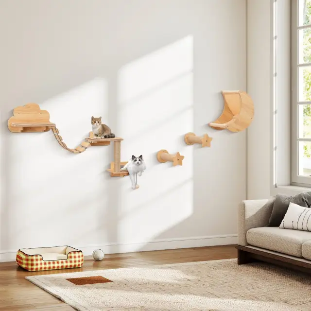 Izboljšajte izkušnje svoje mačke v zaprtih prostorih s šestdelno steno za plezanje za mačke. Komplet stenskega pohištva za mačke zagotavlja večnamenski prostor za igro, sprostitev, praskanje in trening. Šest posameznih kosov pohištva omogoča individualno postavitev glede na vaš prostor. Opremljen je z dvostopenjskim praskalnikom z igrivimi elementi, kot so pomponi in praskalniki, in tako poskrbi za naravne instinkte vašega ljubljenčka. Z mostom lahko povežete različne ploščadi za skakanje in raziskovanje. Poleg tega udobna oblazinjena viseča mreža poskrbi za miren spanec.