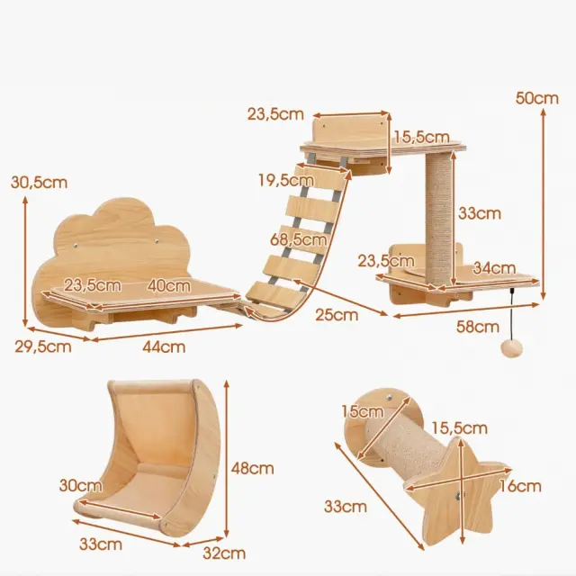 Varna in zanesljiva zasnova: Komplet stenskega pohištva za mačke je večinoma izdelan iz trdnih vezanih plošč in ojačanih nosilcev za vrhunsko stabilnost. Poleg tega nedrseče preproge v kompletu zagotavljajo, da se lahko vaše mačke igrajo in raziskujejo brez nevarnosti zdrsov ali padcev.