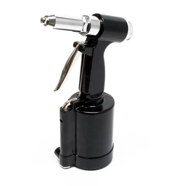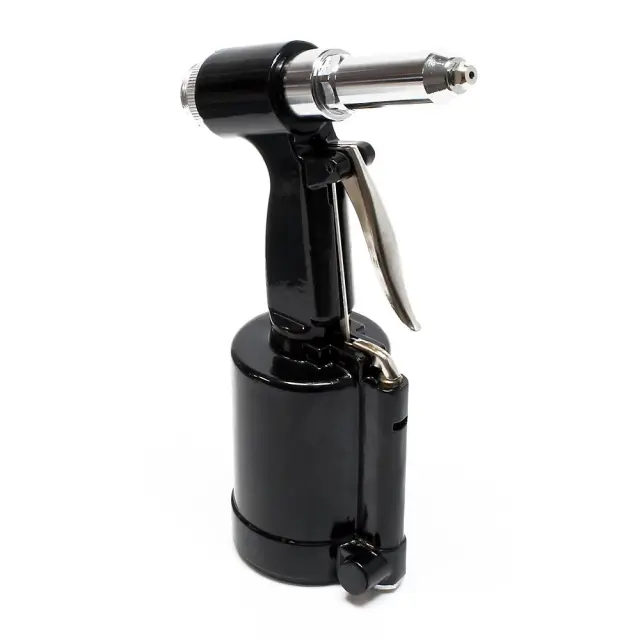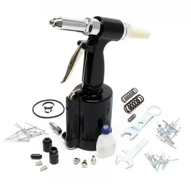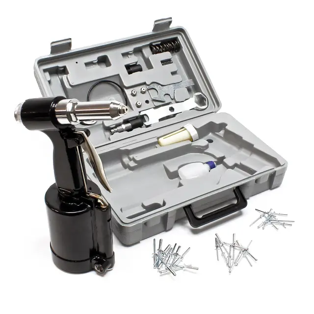 Pištolo za zakovice na stisnjen zrak dobavljamo v praktičnem plastičnem kovčku, vključno z ustniki za zakovice 2,4 mm, 3,2 mm, 4,0 mm, 4,8 mm in viličastim ključem.