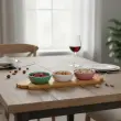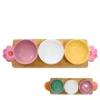 Podstavek iz bambusovega lesa z ročaji v obliki cvetic prinaša pridih narave in pomladne svežine na vašo mizo. Na podstavku so nameščene tri barvne keramične skledice v nežnih pomladnih odtenkih, ki so idealne za serviranje prigrizkov, sadja, sladoleda, omak in drugih dobrot. Primerne so za uporabo v mikrovalovni pečici in pomivanje v pomivalnem stroju.