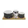Set skledic na lesenem podstavku iz akacijevega lesa, je del linije Graffiti Coffemania, ki se ponaša s črtastimi in geometrijskimi vzorci v črno-beli barvni kombinaciji. Abstrakten dizajn se bo podal tako v tradicionalen, kot tudi moderen interier. V setu so štiri skledice oz. lončki različne velikosti. V njih lahko servirate vloženo zelenjavo, namaze, tortilje in ostale prigrizke. Skledice so izdelane iz porcelana, ki je primeren za uporabo v mikrovalovni pečici in pomivanje v pomivalnem stroju (brez podstavka). Pakirano v lični embalaži, zato je lahko lepo darilo.