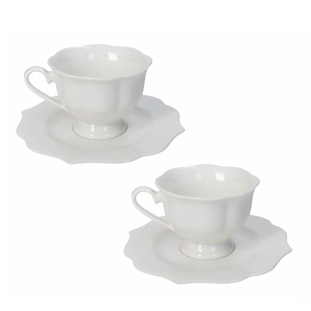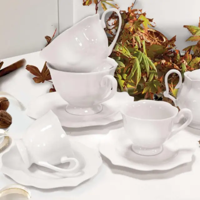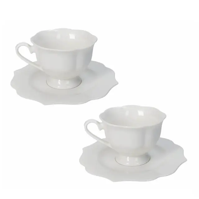 Set dveh elegantnih skodelic za čaj Queen s priloženima podstavkoma, je popolna izbira za ljubitelje prefinjenega čajnega servisa. Skodelici sta izdelani iz belega porcelana New Bone China, ki se ponaša z izjemno trpežnostjo, nežno prosojnostjo in svilnato gladko površino. Njuna klasična oblika z nežno valovitim robom doda pridih elegance vsaki priložnosti. Priložena podstavka poskrbita za popolno doživetje ob uživanju toplih napitkov. To je čudovit komplet za razvajanje ali kot darilo za posebne trenutke. Primerno za uporabo v mikrovalovni pečici in pomivanje v pomivalnem stroju.