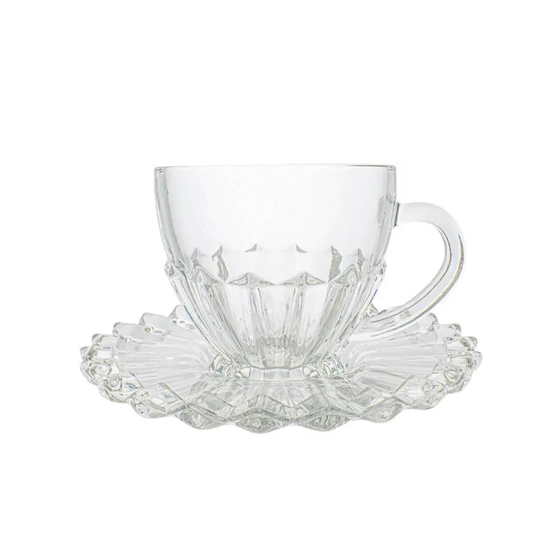 Set šestih elegantnih steklenih skodelic za čaj s podstavkom Stella Crown prinaša pridih prefinjenosti in stila v vašo vsakodnevno rutino. Vsaka skodelica ima prostornino 220 ml, kar je idealno za uživanje vašega najljubšega čaja ali drugih toplih napitkov. Skodelice in podstavki so oblikovani z dekorativnimi nazobčanimi detajli, ki dajejo setu poseben, luksuzen videz. Set Stella je popoln dodatek za družinska srečanja ali posebne priložnosti ter odlično darilo za ljubitelje čaja. Skodelice so primeren za pomivanje v pomivalnem stroju. Premer podstavka je 14 cm, dimenzije skodelice 11x8,5xh7,5cm.