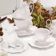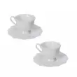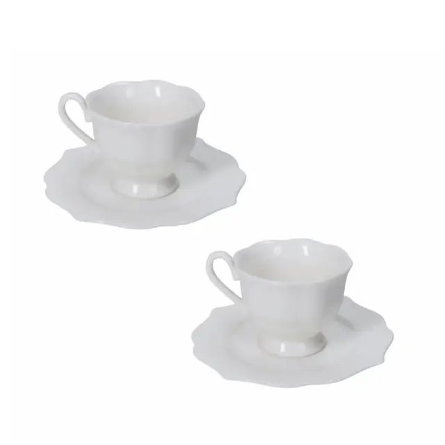 Set dveh elegantnih skodelic za črno kavo Queen s priloženima podstavkoma, je popolna izbira za ljubitelje prefinjenega kavnega servisa. Skodelici sta izdelani iz belega porcelana New Bone China, ki se ponaša z izjemno trpežnostjo, nežno prosojnostjo in svilnato gladko površino. Njuna klasična oblika z nežno valovitim robom doda pridih elegance vsaki priložnosti. Priložena podstavka poskrbita za popolno doživetje ob uživanju toplih napitkov. To je čudovit komplet za razvajanje ali kot darilo za posebne trenutke. Primerno za uporabo v mikrovalovni pečici in pomivanje v pomivalnem stroju.