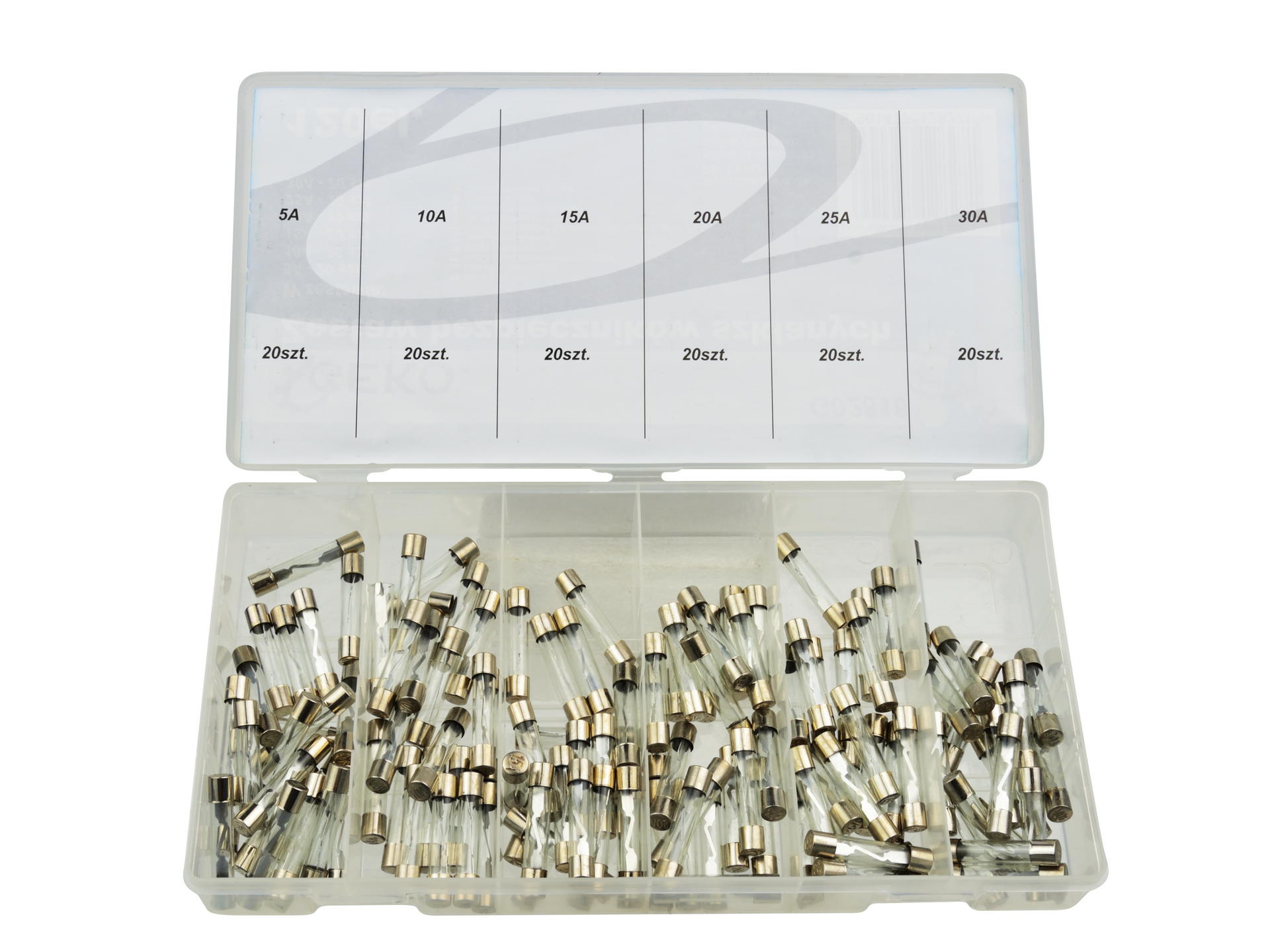 Komplet 120 steklenih varovalk s 6 različnimi amperažami od 5A do 30A. Kapaciteta varovalk: 5A, 10A, 15A, 20A, 25A, 30A plastična posoda s praktičnimi predelki 20 kosov – 5A 20 kosov – 10A 20 kosov – 15A 20 kosov – 20A 20 kosov – 25A 20 kosov – 30A